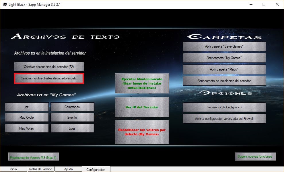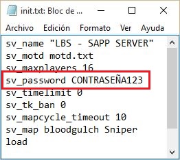 Para poner una contraseña a nuestro servidor deberemos ir a la pestaña de configuración hay una opción que te dice "Cambiar nombre, limites de jugadores, etc" hacer clic ahí y se abrirá un bloc de notas, en el bloc de notas busca sv_password pones un espacio y luego la contraseña que quieras.